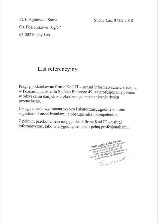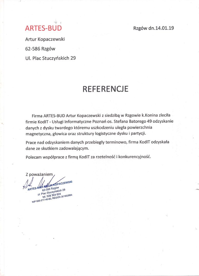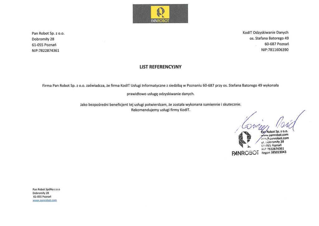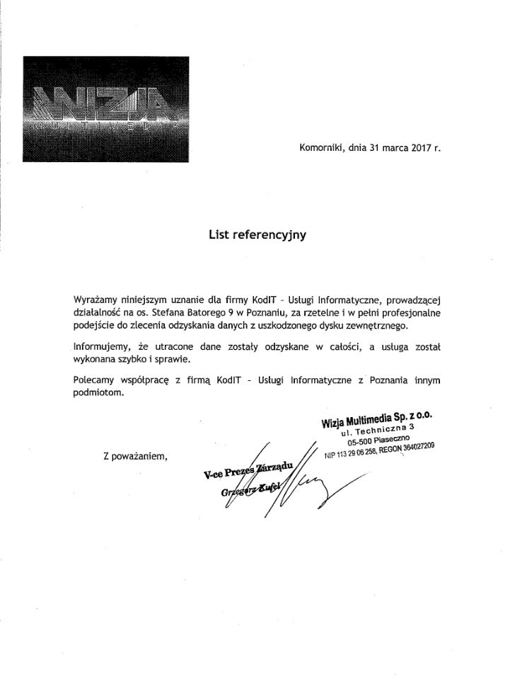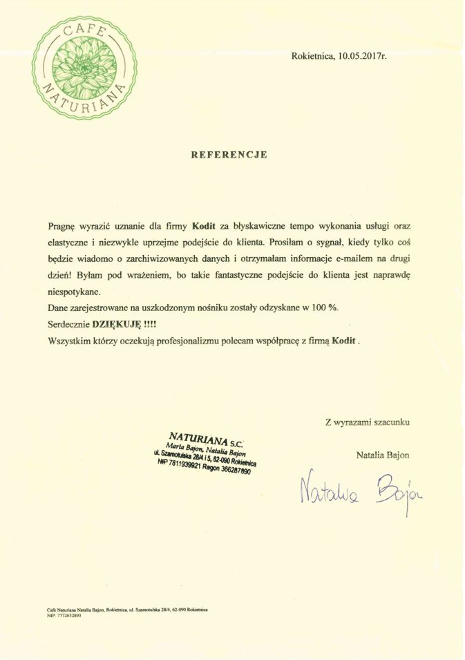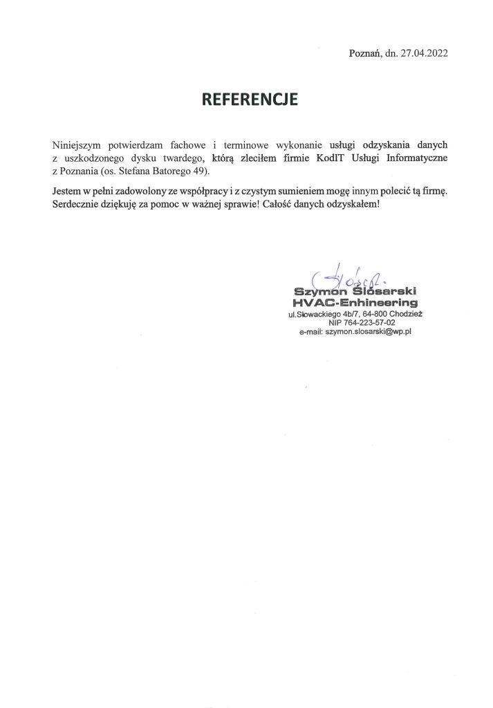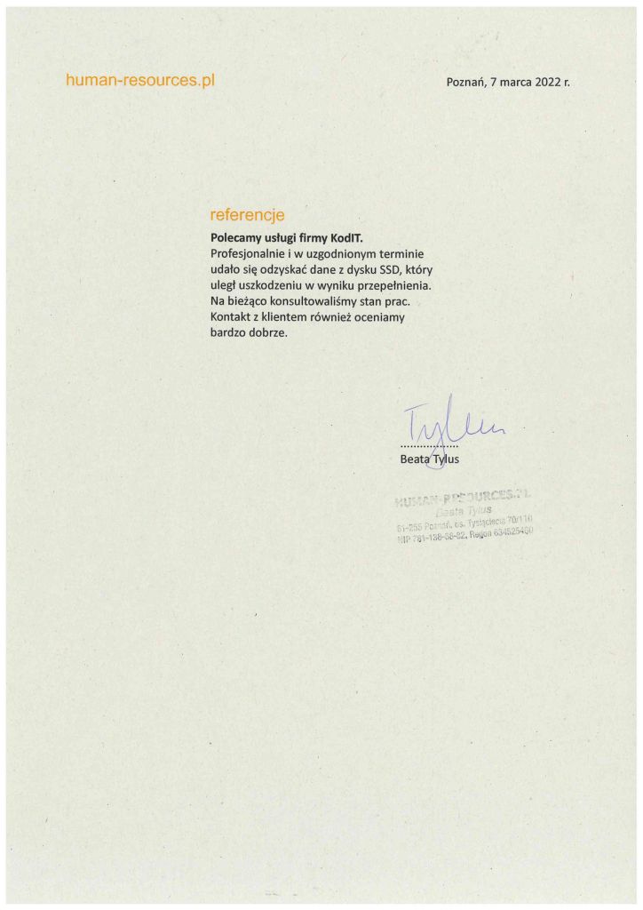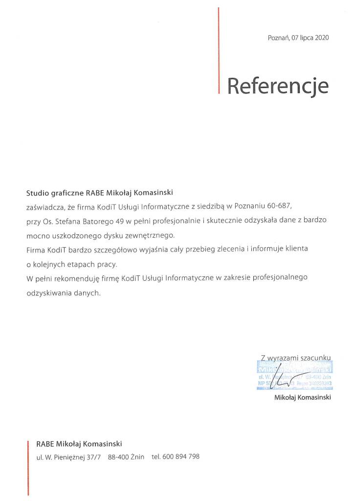 Poniżej zamieszczamy referencje od Klientów, którzy skorzystali z naszych usług odzyskiwania danych. To najlepszy dowód naszej skuteczności.