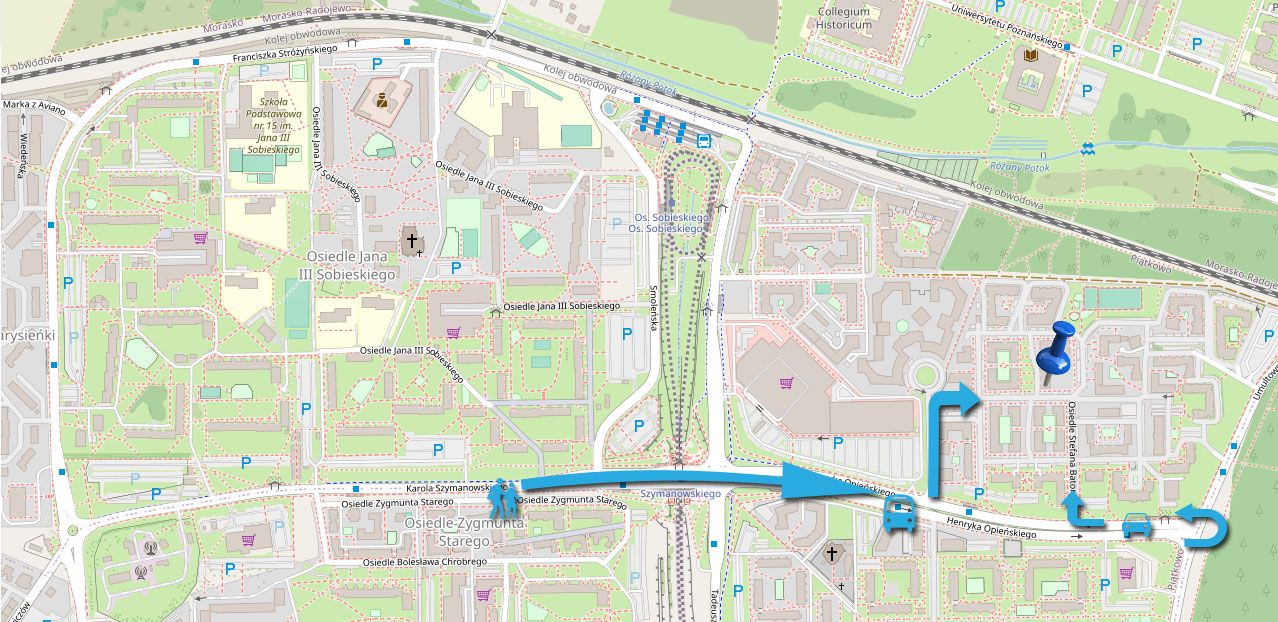 Łatwo i szybko można do nas dojechać zarówno samochodem (ulicą Szymanowskiego a później Opieńskiego, zawracamy po dojechaniu do ul. Umultowskiej).